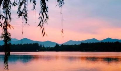 “残霞夕照”是天将晚而未晚、日已落而尚未落尽的时候。“夕阳无限好”,古往今来不知有多少诗人歌咏过这一转瞬即逝的黄金时刻。欧阳修没有直写景物的美,而是说“霞”已“残”,可见已没有“熔金”、“合璧”那样绚丽的色彩了。但这时的西湖,作者却觉得“好”。好就好在“花坞苹汀”。在残霞夕照下所看到的是种在花池里的花,长在水边或小洲上的苹草,无一字道及情,但情却寓于景中了。“十顷波平 ”,正是欧阳修在另一首《 采桑子》里写的“无风水面琉璃滑”。波平如镜,而且这“镜面”浩渺无边。“野岸无人舟自横”,这句出自韦应物《滁州西涧 》诗“ 野渡无人舟自横”。作者改“渡”为“岸”,说明“舟自横”是由于当日的游湖活动结束了,因此这“无人”而“自横”的“舟”,就更衬托出了此刻“野岸”的幽静沉寂。